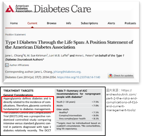 (Atkinsion et al., 2013)紅框文字:不論醫療成本,將血糖控制在正常範圍內始終是第一型患者最重要的治療目標、並避免日後相關併發症的出現。