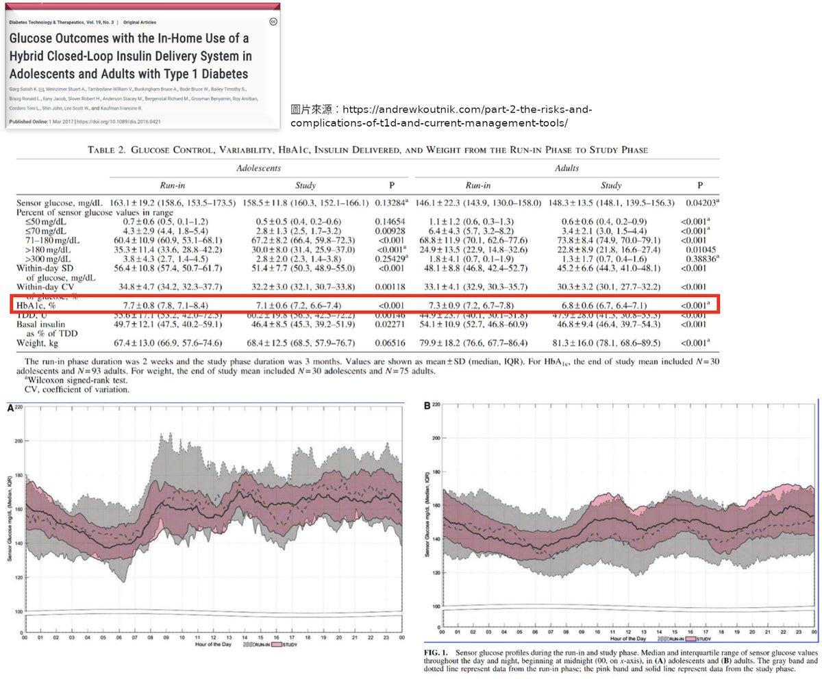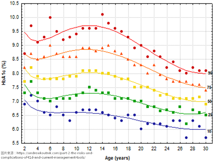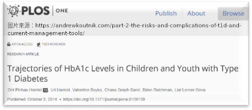 (Maahs et al., 2010):血糖控制試驗是青少年糖尿病照護的基石,但即使在糖尿病控制與併發症試驗(DCCT)中密集治療組與傳統治療組的平均A1c皆比成人高1~2%,且青少年的低血糖發生率仍高於成人。另外最近發表於第一型糖尿病全球血糖控制指南領域的(Hvidøre)指出,有超過2,000名的第一型青少年其平均A1c為8.6%;同樣在(SEARCH)的數據顯示第一型青少年平均A1c為8.2%、且有17%的患者A1c大於9.5%。值得注意的是,數據顯示密集治療的組別對於心血管疾病有較好的療效。有許多因素被認為在青少年血糖控制較成人更差的現象中扮演重要角色,包括……