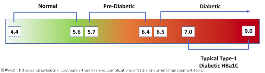 數據顯示2~30歲的第一型糖尿病患者平均血糖約落在154~183 mg/dL(Pinhas-Hamiel et al., 2014),和正常血糖範圍80~120mg/dL相比較,這些第一型糖尿病患者的平均血糖值約為正常數值的2倍,長期如此則各式的併發症就很難倖免了(詳見下文)。