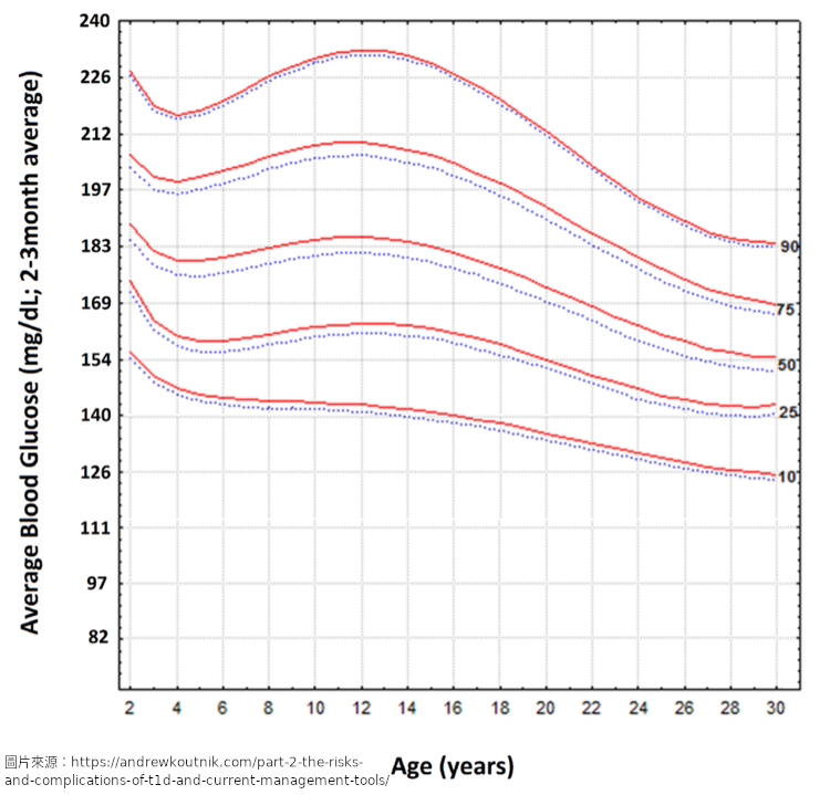 2014年Pinhas-Hamiel及研究人員為了解不同年齡組的平均HbA1c比例,評估了349位第一型糖尿病患者的數據(見圖6;Pinhas-Hamiel et al., 2014),其中黃色線條表示各年齡層受試者的HbA1c中位數,藍色代表最低的10%、紅色則為最高的10%;為了說明這些HbA1c值與平均血糖值之間的關係,我使用了diabetes.org的轉換公式(https://professional.diabetes.org/diapro/glucose_calc)修改了圖6來呈現不同年齡組2~3個月的平均血糖變化趨勢(圖7)。