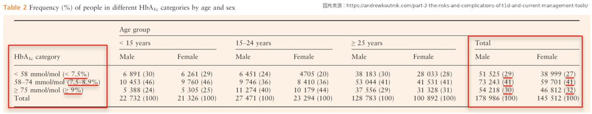 同樣在2014年,一大群研究者分析了來自19個不同國家、高達324,501位第一型糖尿病患者的血糖控制狀況(即HbA1c;McKnight et al., 2015);這是迄今為止規模最大的血糖控制研究報告。他們根據年齡、性別與HbA1c來對第一型糖尿病患者進行分類(表2):他們將比值分為低於7.5%、介於7.5~8.9%及大於9.0%三個區塊,並計算各類別的百分比為何。他們劃分的依據為糖尿病控制與併發症試驗(DCCT)與糖尿病介入與併發症流行病學研究(EDIC)的數據:和HbA1c在小於7.5%相比,大於9.0%時會顯著改變第一型糖尿病的併發症發生率與風險(Nathan et al., 2005; White et al., 2008),而研究人員們想知道有多少的第一型病患是屬於低風險的類別:他們發現有高達72%的患者其HbA1c大於7.5%、相當於平均血糖值大於169mg/dL,且更不幸的是數據指出超過3成(31%)的人其平均血糖值大於212mg/dL。