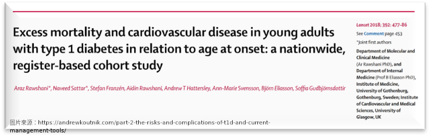 上述的三篇論文(Conway et al., 2018; Livingstone et al., 2015; Rawshani, 2018)只是針對慢性疾病風險及存活率做比較而已,事實上(Murphy SL, 2017)指出第一型糖尿病患者在所有的前十大死因皆有極高的死亡風險。